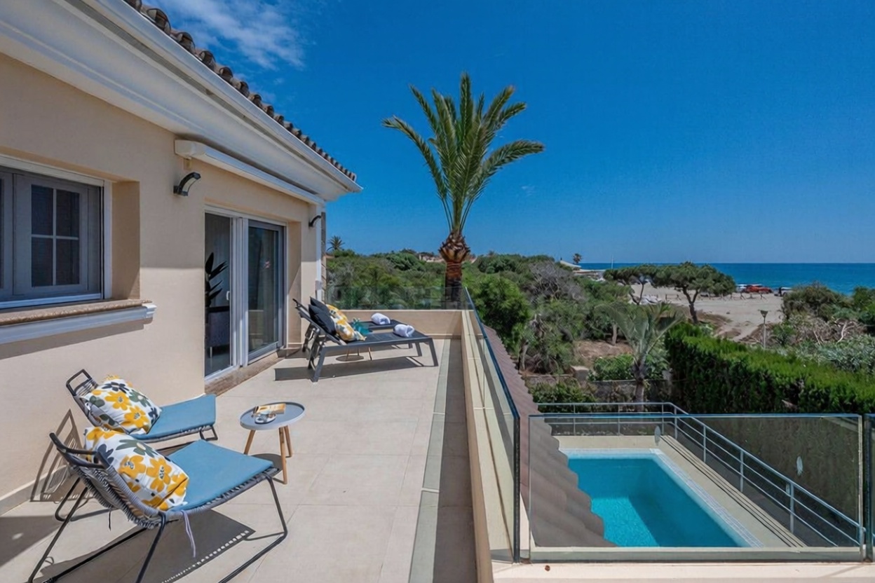 Descubre esta espectacular casa independiente de 321 m² construidos, ubicada en primera línea de mar, que te ofrece una experiencia de vida inigualable. Con 6 habitaciones y 4 baños, es perfecta para familias que buscan comodidad y estilo. La propiedad cuenta con un amplio jardín y piscina, ideal para disfrutar del sol y la tranquilidad. Disfruta de vistas al mar desde su terraza y relájate con la calefacción individual y aire acondicionado. Incluye plaza de garaje y armarios empotrados. ¡Ven a vivir en un entorno privilegiado!